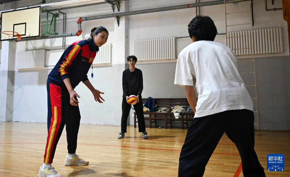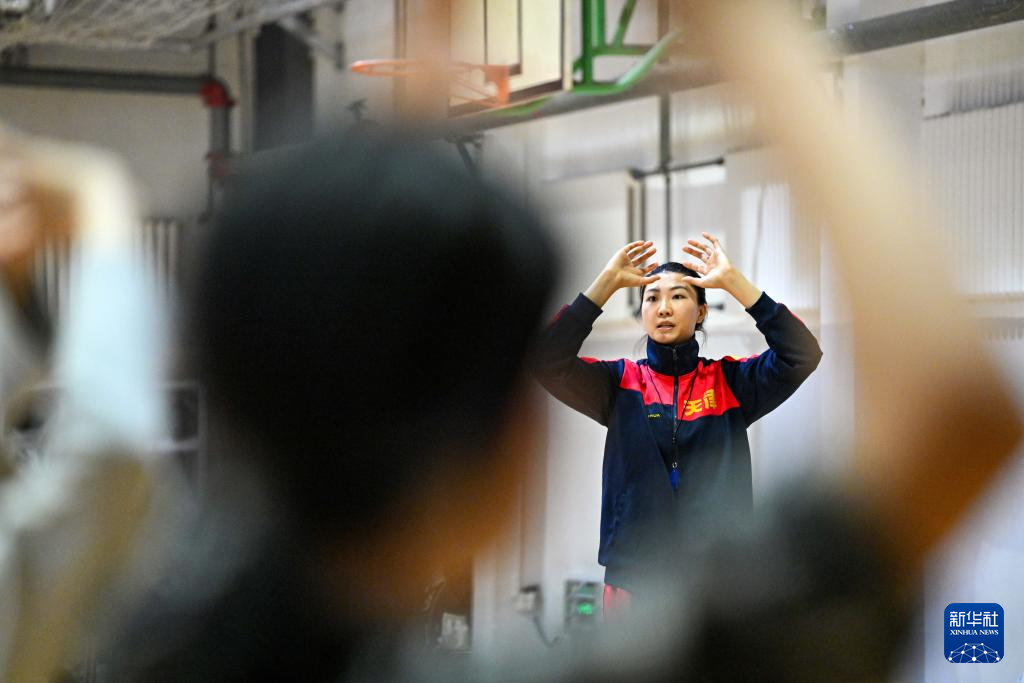 袁心玥(左)在南开大学八里台校区体育馆指导学生练习(4月10日摄)。新华社记者 赵子硕 摄pagebreak