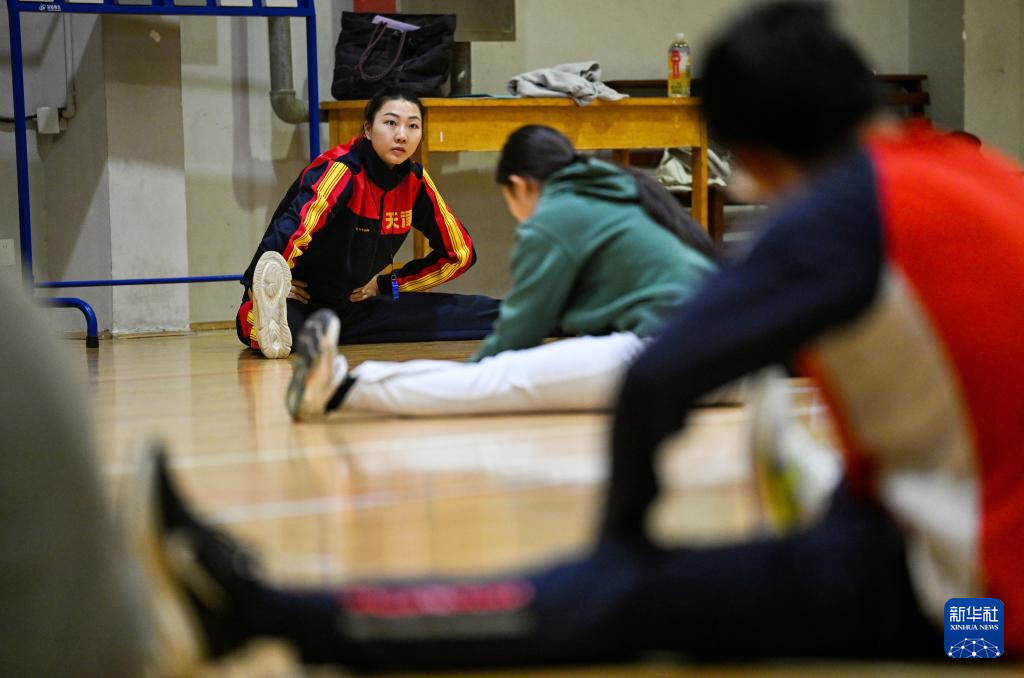 袁心玥(左)在南开大学八里台校区体育馆带领学生热身(4月10日摄)。新华社记者 赵子硕 摄pagebreak