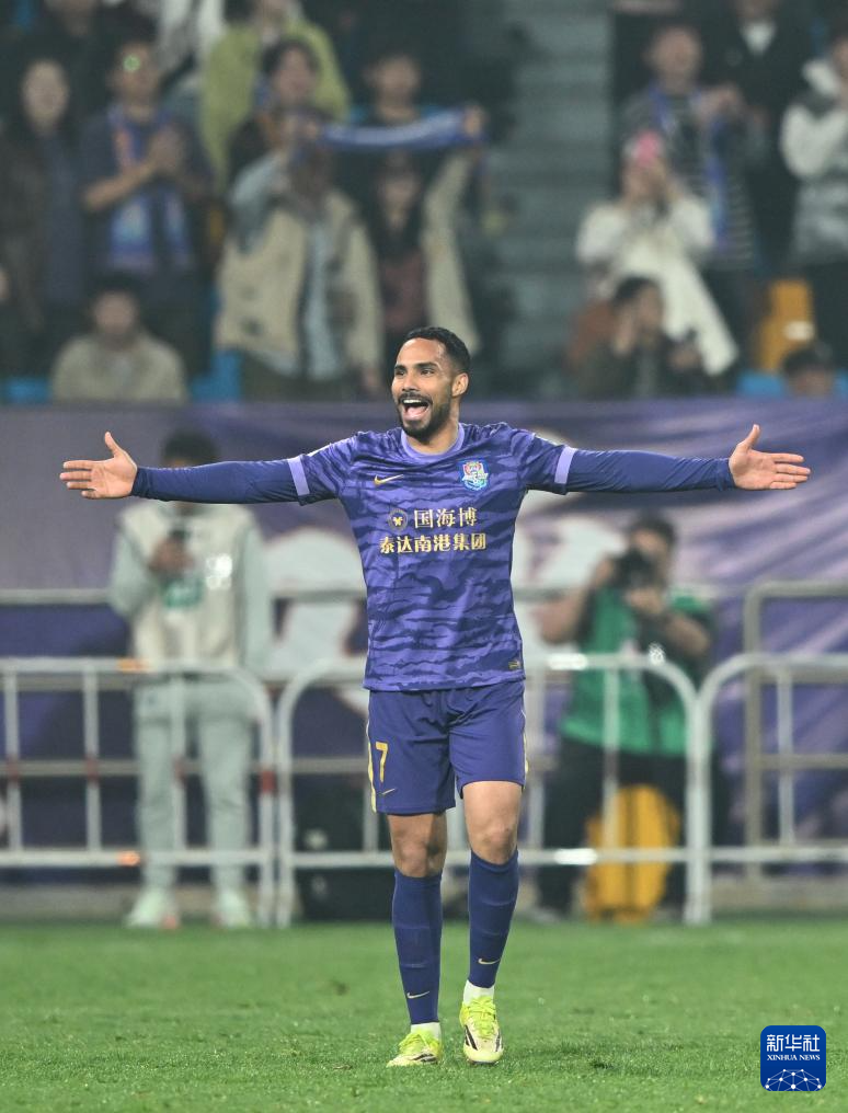 4月12日,天津津门虎队球员谢蒂内进球后庆祝。新华社记者 孙凡越 摄pagebreak