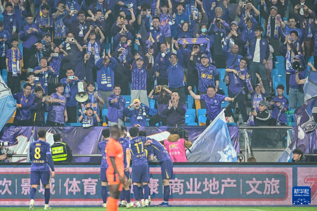4月12日,天津津门虎队球迷在谢蒂内进球后庆祝。新华社记者 孙凡越 摄