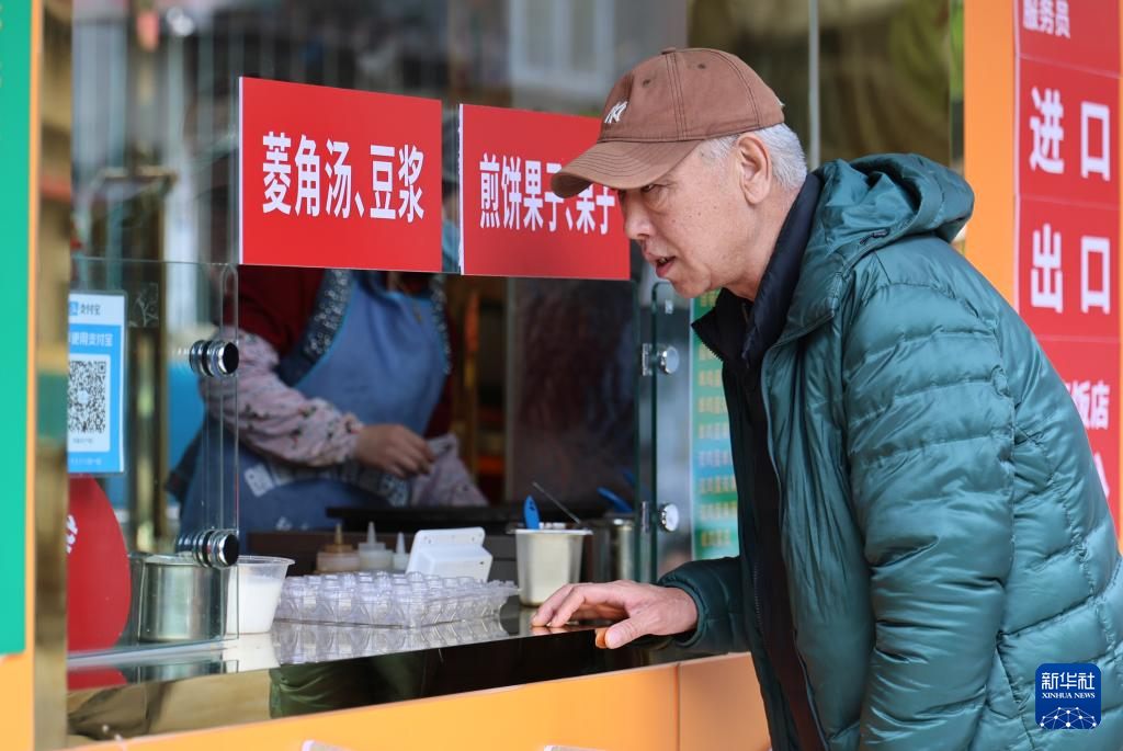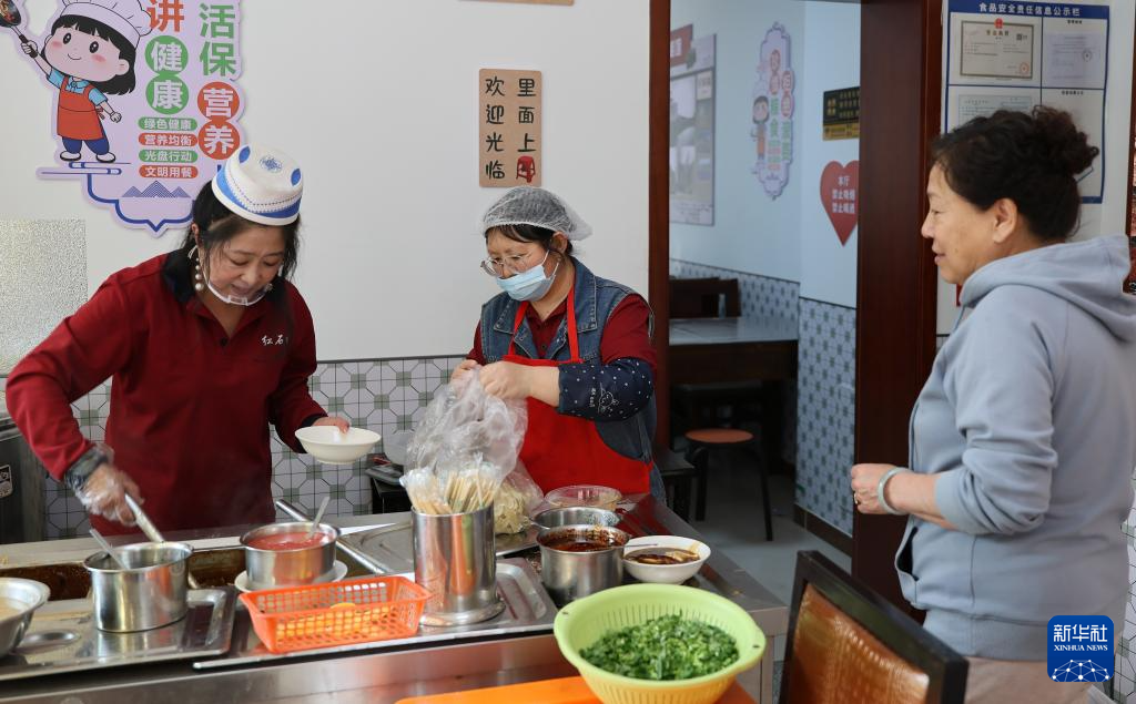 4月14日,红石榴大食堂工作人员给顾客盛锅巴菜。新华社记者 李然 摄