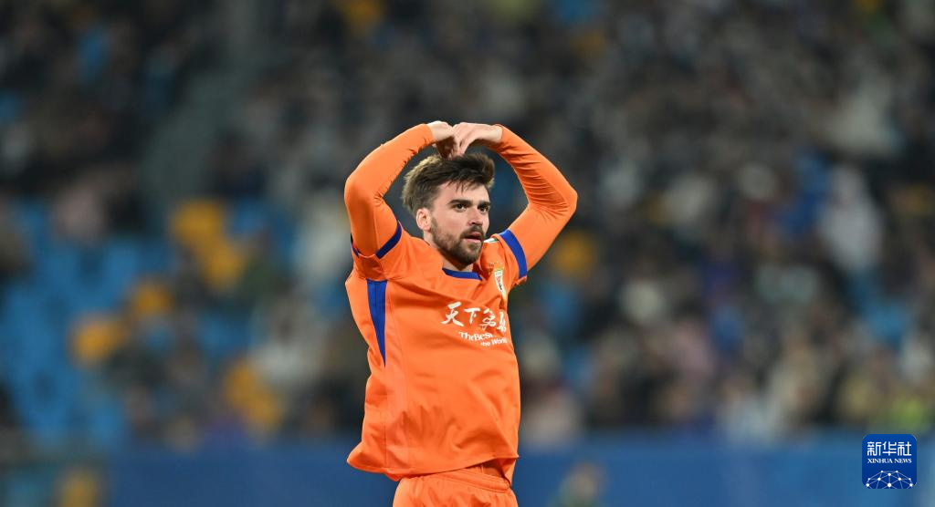 4月21日,山东泰山队球员泽卡在进球后庆祝。新华社记者 孙凡越 摄