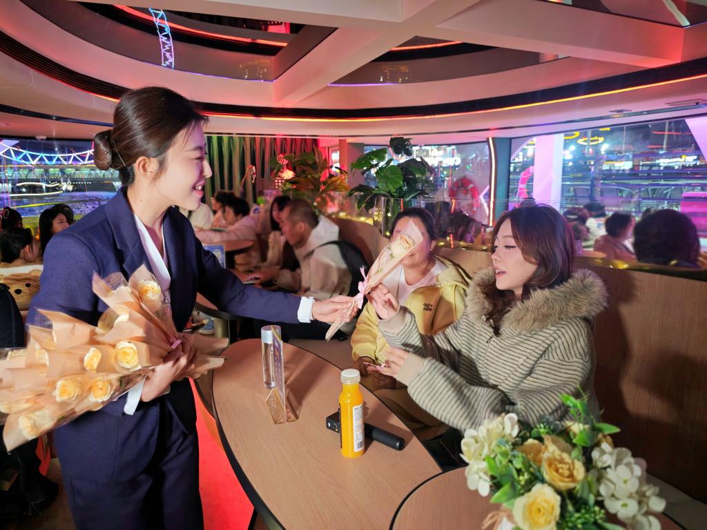 船舱内,座位错落分布,灯光柔和,氛围松弛。360度全景玻璃窗将两岸景色尽收眼底,小型舞台上,驻唱歌手的歌声与窗外流动的夜色交织。有人倚窗远望,有人围坐交谈,也有人随着音乐轻轻摇晃手中的酒杯。