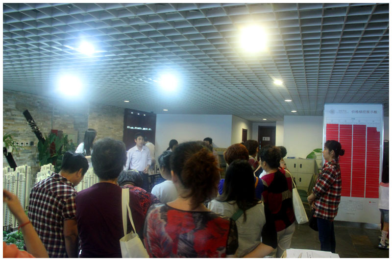 【14:10】项目销售人员为大家讲解项目沙盘、区域优势以及相关配套。从现场了解到,项目为50-60平2室2厅2卫Loft家,买一层送一层,精装修,层高4.8米,8层到顶,均价9000-10000元/㎡,购房优惠8个点。有的购房者听到这个好消息很兴奋,把销售人员围得水泄不通。