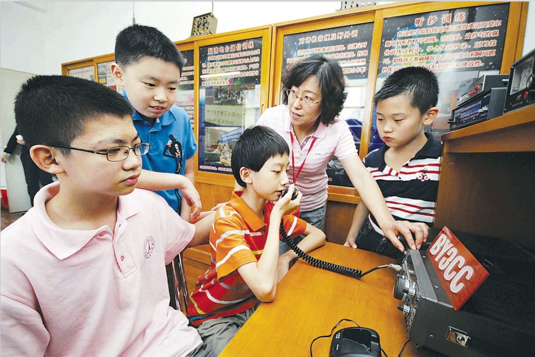 昆明路小学教师指导学生发报