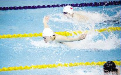 9月12日,第九届全国大学生运动会游泳比赛预赛在天津工业大学游泳馆举行。来自各省市和香港、澳门特别行政区的22个代表队参赛。在男子乙组400米个人混合泳预赛中,来自天津代表队的王铖湘(中)以4′18″93的成绩打破大运会记录。 李想 摄