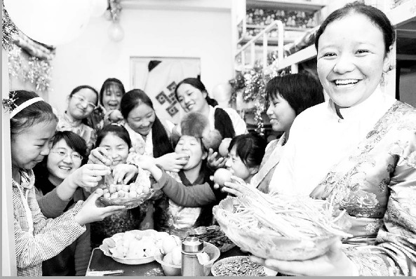 记者听说学校有位教师已经8年没和家人一起过春节了,但深入采访后发现,学校里这样的教师还有很多。“别说是回家过年,只要担任班主任工作,这些老师回家就没有点儿了,确实放心不下自己的学生啊。”说话的是李宏伟老师,他多年担任班主任工作。今年学校没有安排李宏伟担任班主任工作,他一次次向领导请命,“要说工作不辛苦,那是假的,但是跟这些藏族学生在一起的幸福也是无法替代的。”