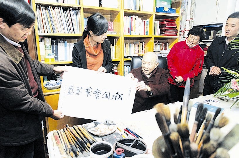 ▲11月8日是天津美术学院教授、著名画家夏明远的100周岁生日,恰逢党的十八大胜利开幕。该校师生来到夏老家为他庆祝百岁寿诞,夏老欣然提笔,写下"祖国繁荣昌盛",表达对党的热爱和对祖国的祝福。