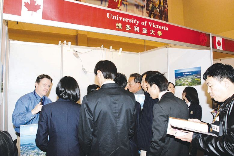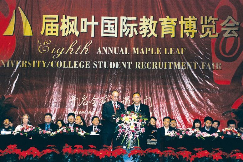 2005年,枫叶教育集团为解决逐年递增的毕业生出口对接问题,首创“国际大学招收枫叶学生博览会”,并一举获得成功。这种形式,不仅有效解决了枫叶越来越多毕业生的出路问题,而且为毕业生开辟了出国留学的直通车。国际教育博览会在天津校区已成功举办两次,首届有50名毕业生全部升入国外大学,60%的毕业生升入世界排名前100位的大学,共获得近60万元人民币的奖学金;第二届毕业生共有131人,72%的毕业生升入世界排名前100位的大学,其中有94名学生获得302万元人民币的奖学金;今年又有150名毕业生即将走出国门。