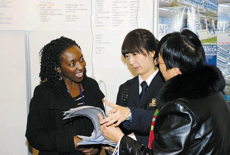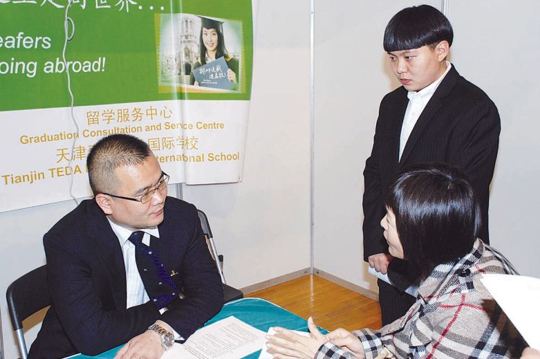 在博览会现场,记者看到许多学生家庭都是全家到会。总校长龙永祥介绍,参加博览会的主要是高三毕业生,另一部分是高一和高二年级的学生及家长,还有一部分是对泰达枫叶国际学校感兴趣,想报名进入枫叶学校学习的学生和家长,他们通过在博览会上与学生和国外院校的招生代表攀谈了解枫叶的办学水平。在多伦多大学、温莎大学和维多利亚大学咨询处前,记者见到一位学生家长穿梭于这3所大学间反复咨询、比较,忙得不亦乐乎。这位家长是该校高三学生小苑的父亲,他兴奋地告诉记者:“这3所大学是孩子比较心仪的院校。之前,我们只能通过网络或其他渠道了解这些学校的相关信息,但信息不详细,也不清楚。现在,通过枫叶学校搭建的这个平台,我们与国外大学直接沟通交流,足不出户就可以了解世界各地名校的信息,选择适合自己孩子的高校,不会因盲目而错选或落选,真是太方便了。”