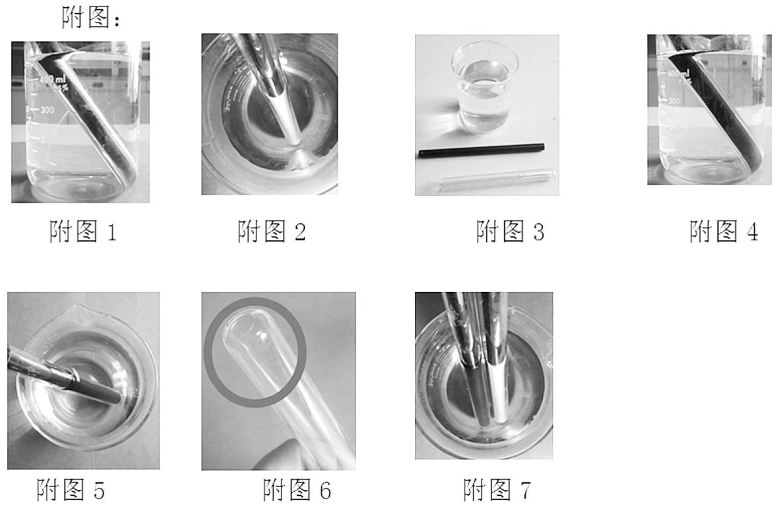 被拿走的是23组仪器,送回来的也是23组仪器,却有一组仪器与众不同:烧杯里盛着水,试管斜插在烧杯里,试管里装着胶棒。无论从哪个角度看,都可以看到试管中的胶棒(见附图4、5)。