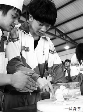 参观烹饪实训基地,同学们也想试试身手。最简单的切土豆丝,有的同学不知如何拿刀,有的同学切得大小不一。高一(2)班学生刘建婷告诉记者,自己在家从没做过家务,今天一动手才知道这么不容易,但同时她又觉得很有趣,通过自己的手让一件件普通的食材变得美丽、美味,一定很有成就感。她表示,如果有机会也想来学烹饪专业。