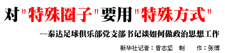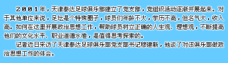 2003年俱乐部工作的重点是"打入前六名,确保2004年中超联赛"。针对这一目标,我们年初即制定了相应的政治思想工作计划。一是组织上本年度至少发展两名党员,以激励球队团结拼搏;二是思想上建立团体归属意识,用泰达精神鼓舞队员的斗志;三是强化职业素质教育,借以发扬拼搏精神。因此,我们将至少安排两次参观,两次相关知识的竞赛,至少每月讲一次党课。而且,党课的内容以学习"三个代表"思想为主,同时围绕这一主题进行相关的历史、道德、法律和政治知识介绍。