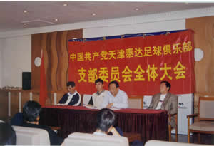 2003年俱乐部工作的重点是"打入前六名,确保2004年中超联赛"。针对这一目标,我们年初即制定了相应的政治思想工作计划。一是组织上本年度至少发展两名党员,以激励球队团结拼搏;二是思想上建立团体归属意识,用泰达精神鼓舞队员的斗志;三是强化职业素质教育,借以发扬拼搏精神。因此,我们将至少安排两次参观,两次相关知识的竞赛,至少每月讲一次党课。而且,党课的内容以学习"三个代表"思想为主,同时围绕这一主题进行相关的历史、道德、法律和政治知识介绍。